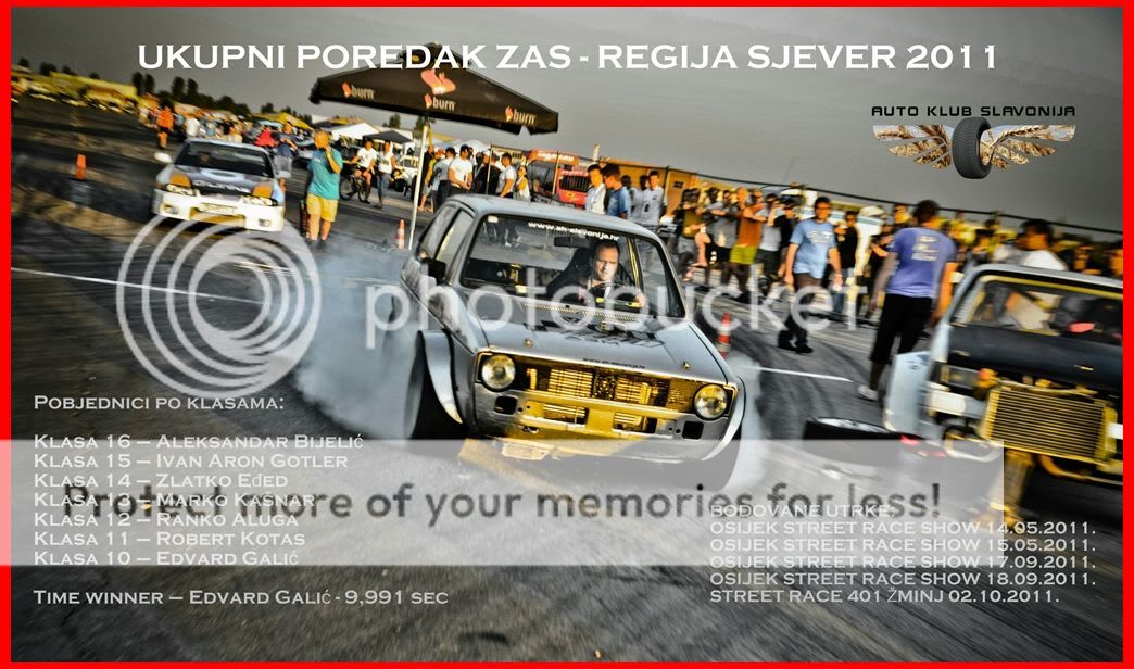 ![]() ![]() Još jedna godina je za nama. Ova nije bila toliko nabijena eventima kao 2010, ali ovu su obilježile neke druge stvari. AKS STAFF se profilirao kao jedna od najboljih ekipa u ovom i sličnim sportovima. Profesionalno, učinkovito i koliko okolnosti dopuštaju, bez greške. Dokaz ovome su bile utrke u Umagu i u Bosanskoj Gradišci, gdje je ekipa na potpuno nepoznatom terenu i uz gomilu improvizacije, odradila utrku. Bravo, dečki i cure. Osijek Street Race Show je postao tradicija, što je i bio cilj. I što bude stariji, to će biti bolji. Sada smo utvrdili gradivo, i idemo se baciti na ovaj show u nazivu. O ovome više u mjesecima koji dolaze, ali 2012 će biti vruća godina. 402SR se vratio, Žminj je tu tradicionalno, Dario Ljubičić i AK Brzina su nejveće iznenađenje sezone (i najugodnije) i od njih očekujemo još više nagodinu, dugo več pričamo o trkama u BiH i Srbiji i vjerujem da će 2012 biti godina i za te planove... ljudi, SR se VRATIO!!! Kako se sada 2009. čini daleka, kada je sve spalo na Osijek. Za iduću godinu spremamo potpuno novu mjernu opremu, koja će otvoriti vrata za brojne projekte koje za sada stoje samo na papiru i u našim glavama. Potpuna informatizacija svih procesa na utrci, dostupnos podataka u realnom vremenu (kako na pisti, tako i na web-u), brojne statistike potpuno novi AKS portal. Ostalo neka ostane iznenađenje... Street Race kao sport? Da, i to je izgurano. HAKS i njegove institucije su posebna priča, kao i mitovi o licencama, "službenim" utrkama i sličnim stvarima. Bili smo pod istragama, pred tužbama, sugerirano nam je da se ostavimo toga, ili da platimo "licence", a mi smo od svega toga naprivili -ništa. A kako me je u tom procesu posebno (a i inače u životu) naživciralo puno priče a nikakav rezlutat, tako je odlučeno da se i ovo ispravi, na nacionalnom nivou. Prvi put u povjesti, SR je bodovan i priznat službeno. I tako, u 12. mjesecu ćemo ići na dodjelu godišnjih priznanja. Kome, to već dobro znate. Ovome su se priključili i Žminj, a od iduće godine i AK Brzina. Ovdje ću izdvojiti jedno ime: Jasminka Beganović (Team SPUTNIK), koja je uložila sate, dane, i kilometre u direktne razgovore u Zg. Bravo, Jammie. Ponosni na AKS? Zauvjek... ![]() ![]() |