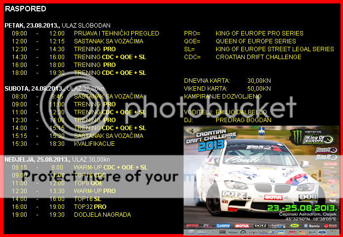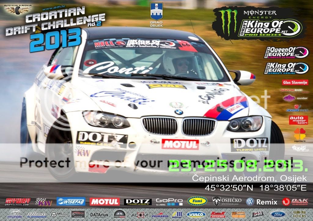 Drugi put ove godine!!!! Croatian Drift Challenge na Osječkom aerodromu!!! Croatian Drift Challenge u suradnji sa AK Slavonija organiziraju drugu utrku u sezoni 2013. na Osječkom aerodromu s time da nas ove godine očekuju mnoge novosti u svijetu Drifta. CDC se drugi put zaredom održava zajedno sa King of Europe Drift natjecanjem a također je u pripremi Gymkhana koja bi se trebala voziti u sklopu Mega vikenda. Mega vikend koji će trajati 3 dana obilovat će akcijom, adrenalinom, mirisom oktana i bogatim sadržajem. Za najvišu stepenicu na podiju borit će se najbolji drifteri iz Hrvatske, Slovenije, Srbije, Italije, Mađarske, Bosne i Hercegovine i ostalih Europskih zemalja. Brojni gledatelji moći će isprobati zašto je DRIFT trenutno jedan od najpopularnijih auto sportova na svijetu jer će se nuditi i DRIFT TAXI vožnja s natjecateljima. Uz bogati sadržaj posjetitelji će moći uživati i u atraktivnim hostesama, sexy car washu ili potražiti osvježenje u ponudi jela i pića. Treninzi i Drift Taxi odrzavat ce se u subotu 24..08., a u nedjelju kvalifikacije i top 16 vozača koji se bore do finala. Najboljih 16 vozača za podij će se boriti uzbudljivim twin drift vožnjama!!!! Cijena ulaznice 30 kn po danu Ulaz otvoren od 09:00 h. SLUŽBENI POKROVITELJI: C-mod, Dak Motorsport, Fami, Auto Fef, Daj folije, Tahograf Očekujemo vas U zračnoj Luci Osijek! PRIJAVE VOZAČA ŠALJITE NA: driftklub.hr@gmail.com U prijavi navesti Ime i prezime: E-mail adresa: Automobil: Snaga automobila (KS): Što vas očekuje na Osječkom Aerodromu • Drift Taxi • Nagradna igra za posjetitelje • Show off • Sexy car wash • Ulaz od 09:00h Važna obavijest za sve vozače: Pretkvalifikacije za vozače (novake) koji se prijave najkasnije do četvrtka 22.08. održat će se u petak oko 18h. Pretkvalifikacije se plaćaju 100kn. Tko prođe, nadoplaćuje razliku do 300 kn (osiguranje i startnina) u subotu ujutro na prijavama. U pravilniku su navedene vrlo važne promjene: ZABRANJUJE SE KORIŠTENJE GUMA BEZ DOT OZNAKE I NA PREDNJIM I NA STRAŽNJIM KOTAČIMA! OBAVEZNO JE TRKAĆE SJEDALO (ŠKOLJKA) i POJAS SA KOPČAMA U 3 ILI 4 TOČKE TAKODJER JE ZA SVE VOZAČE OBAVEZAN TRKAĆI ZAŠTITNI KOMBINEZON I ZAŠTITNA KACIGA! Striktno ćemo se držati satnice što se tiče prijava i sastanka vozača. Tko se ne pojavi na vrijeme, neće moći sudjelovati na natjecanju. Neće se moći prijaviti nitko tko nije poslao prijavu najkasnije do srijede 21.08.2012.g. Drift taxi će se voziti za vrijeme treninga. Naplaćivat će se 100 kn za 2 kruga. Svaki vozač koji želi voziti drift taxi mora osigurati kacigu za suvozača. Drift taxi NE SMIJU voziti vozači koji voze prvi put natjecanje! Startnina se plaća u iznosu od 300 kn ili 40€. Akreditacije će dobiti vozač + 1 mehaničar! U slučaju bilo kakvih izmjena, Organizator zadržava pravo promjene termina, mjesta i datuma održavanja utrke. ORGANIZATOR |